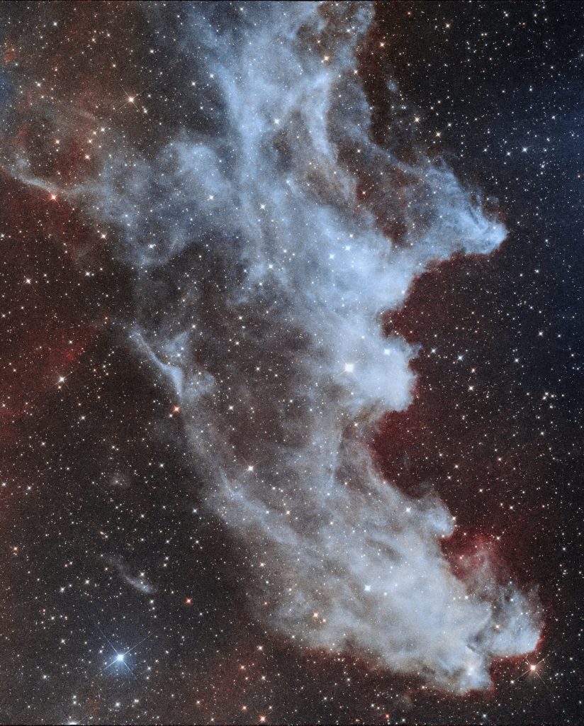 Der Hexenkopfnebel ist ein Reflexionsnebel südöstlich des Orion-Komplexes im Sternbild Eridanus. Er wird von Rigel, dem hellsten Stern im Sternbild Orion, beleuchtet. Rigels Schatten ist oben rechts im Bild noch zu sehen. Der Nebel wurde mit demTakahashi Epsilon 160 ED und der Lacerta 2600C Kamera aufgenommen. Es wurden 30 Bilder zu je 300s geschossen. Aus ästhetischen Gründen wurde das Bild um 180° gedreht, so dass Norden sich jetzt unten befindet. Das Bild wurde links und rechts leicht beschnitten.