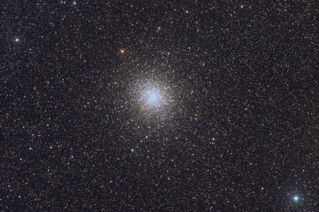 Messier 22 (NGC 6656) ist ein Kugelsternhaufen im Sternbild Schütze und steht in Richtung des Milchstraßenzentrums. M22 ist der hellste von Europa aus sichtbarer Kugelsternhaufen, der allerdings sehr tief am Südsternhimmel steht. Er besteht aus ca. 80.000 Sternen, unter denen ungefähr 100 als veränderliche Sterne eingeordnet werden können. Er wurde mit dem TS 12“ Newton-Astrograph und RGB-Filtern Astronomik Deep Sky (3 x 8 Bilder á 3 min) aufgenommen.