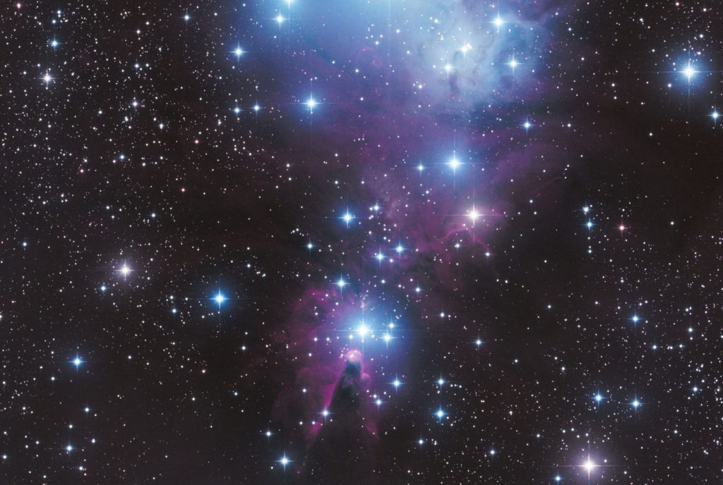 NGC 2264 im Einhorn bildet eine schöne Kombination aus (von Nord nach Süd) einem offenen Sternhaufen, Emissions- und Reflexionsnebel und HII-Region. Besonders die Dunkelwolke des Konusnebels zeigt in seiner prächtigen Form ein interessantes aktives Sternentstehungsgebiet. Aufgenommen mit dem 12″-Newton und belichtet je 20×180 sec LRGB mit der Lacerta-Monokamera.
