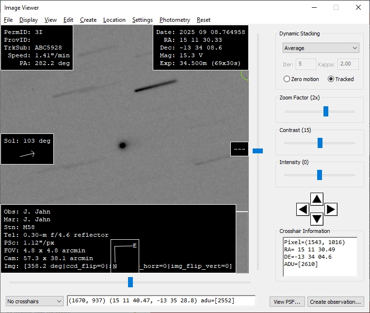 Operator : Jost Jahn Aufnahmedatum : 08.09.2025Der neue interstellare Komet 3I/ATLAS mit 205x30s und L am 12″ der VdS. Schweif etwa 30″ Länge. Helligkeit ca. 15.4
