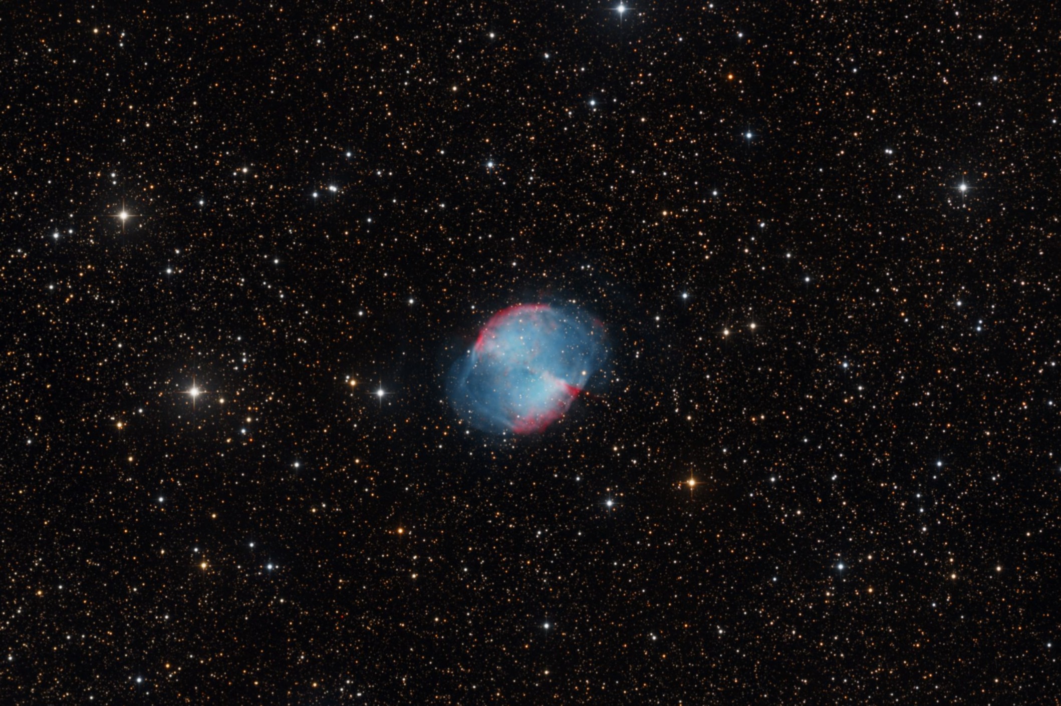 Operator : Markus Büchler Aufnahmedatum : 22. Juli 25Vor ca. 10.000 Jahren aus einem roten Riesenstern entstanden dehnt sich der Hantelnebel in 1300 Lj Entfernung mit etwa 30 km/sec aus. Die 3 Std.-Aufnahme basiert auf je 20 x 180 sec. R-,G-,B-Aufnahmen mit der Monokamera des 12″-Newton auf Hakos.